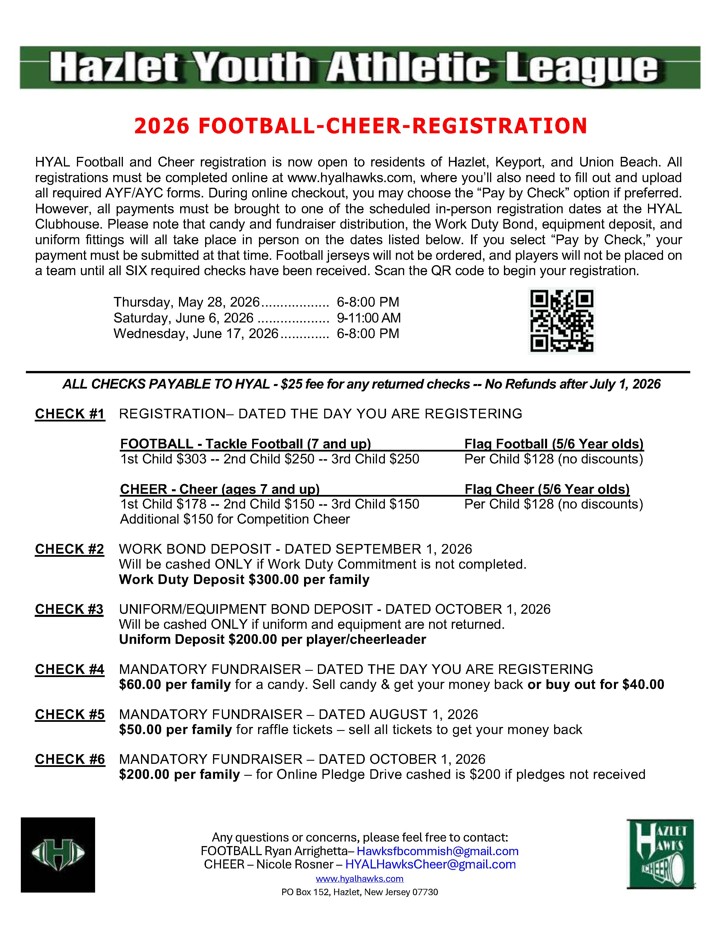 ALL CHECKS PAYABLE TO HYAL - $25 fee for any returned checks -- No Refunds after July 1, 2026